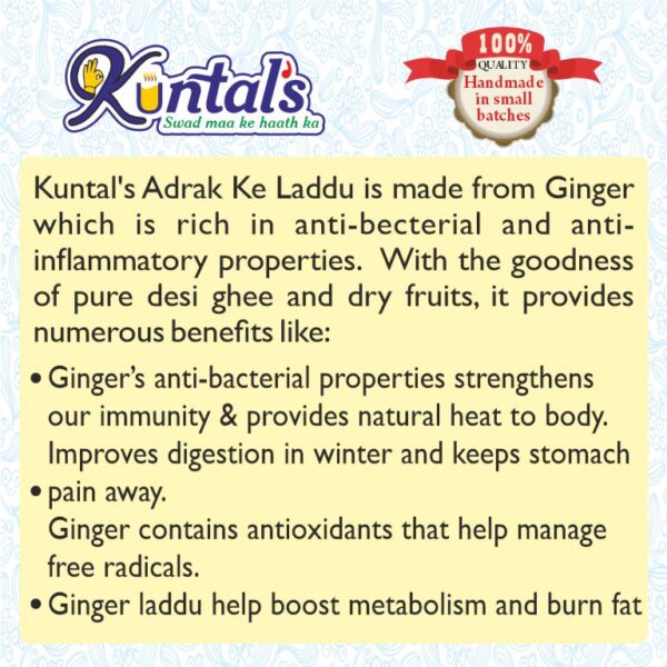 Kuntal’s Adrak Ke Laddu is made from Ginger which will maintain natural temperature of body and provide immunity to body from cold. The Desi Ghee and dry fruits provides nutrition to body in winters.