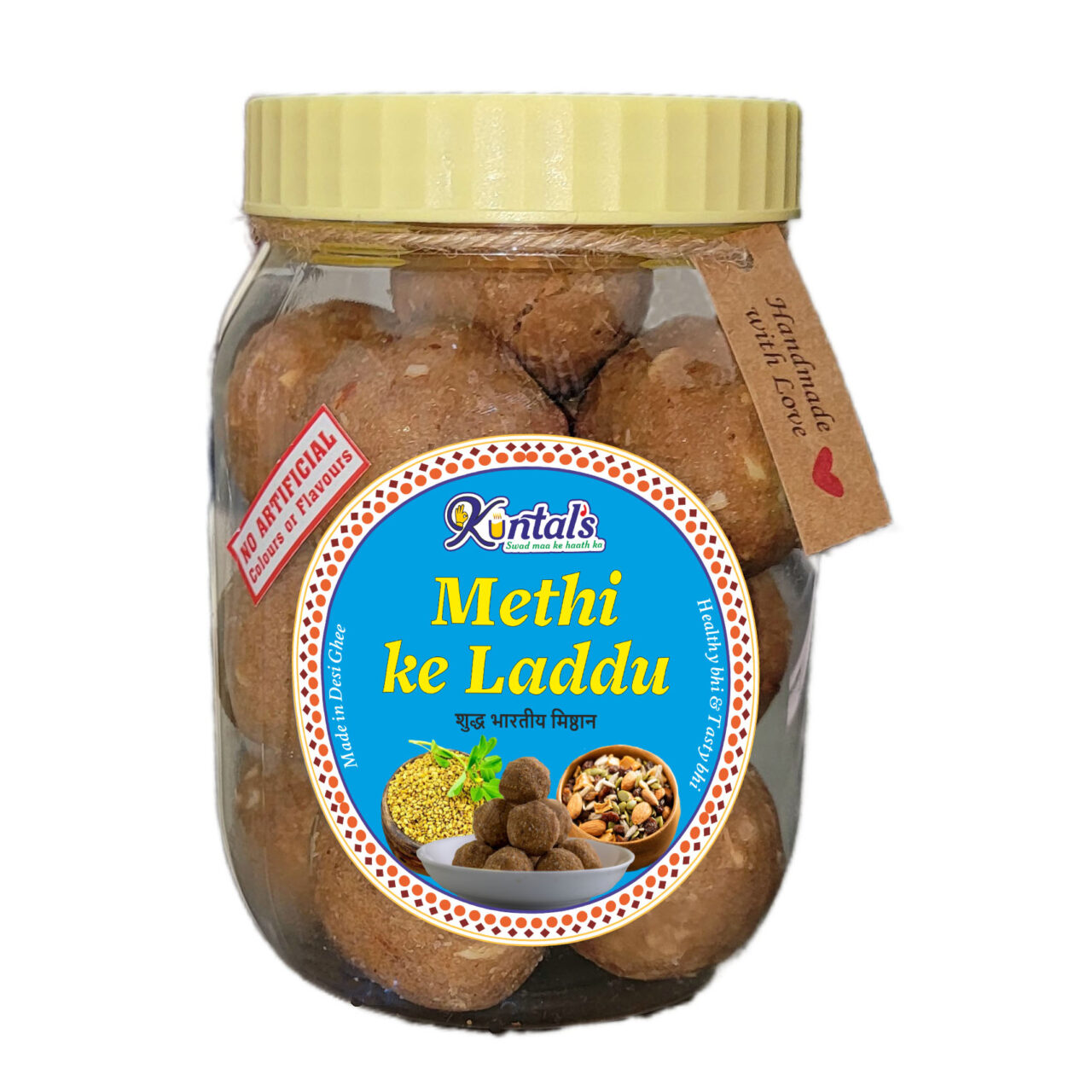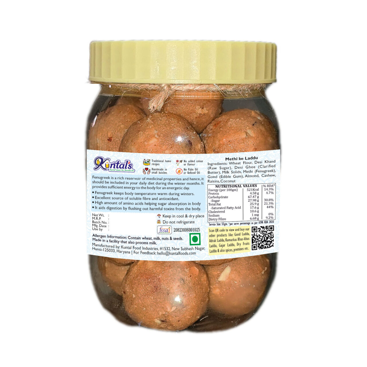 Ingredients: Methi (Fenugreek Seeds), Desi Ghee, Wheat Flour, Khand (Raw Sugar), Milk Solids, Gond (Natural Gum), Almonds, Cashew, Rasins, Coconut.