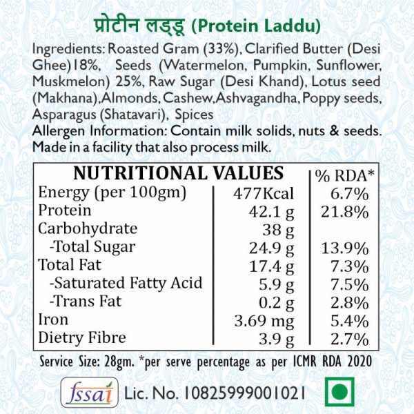 Protein laddus are nutrient-dense, high-protein, and high-fiber energy balls made with a combination of Gram flour, nuts, seeds, dried fruits, Ashvagandha & shatavari etc. making it a healthy snack for energy boosts. Each laddu has approx 23grams of protein. It does contain wheat gluten.